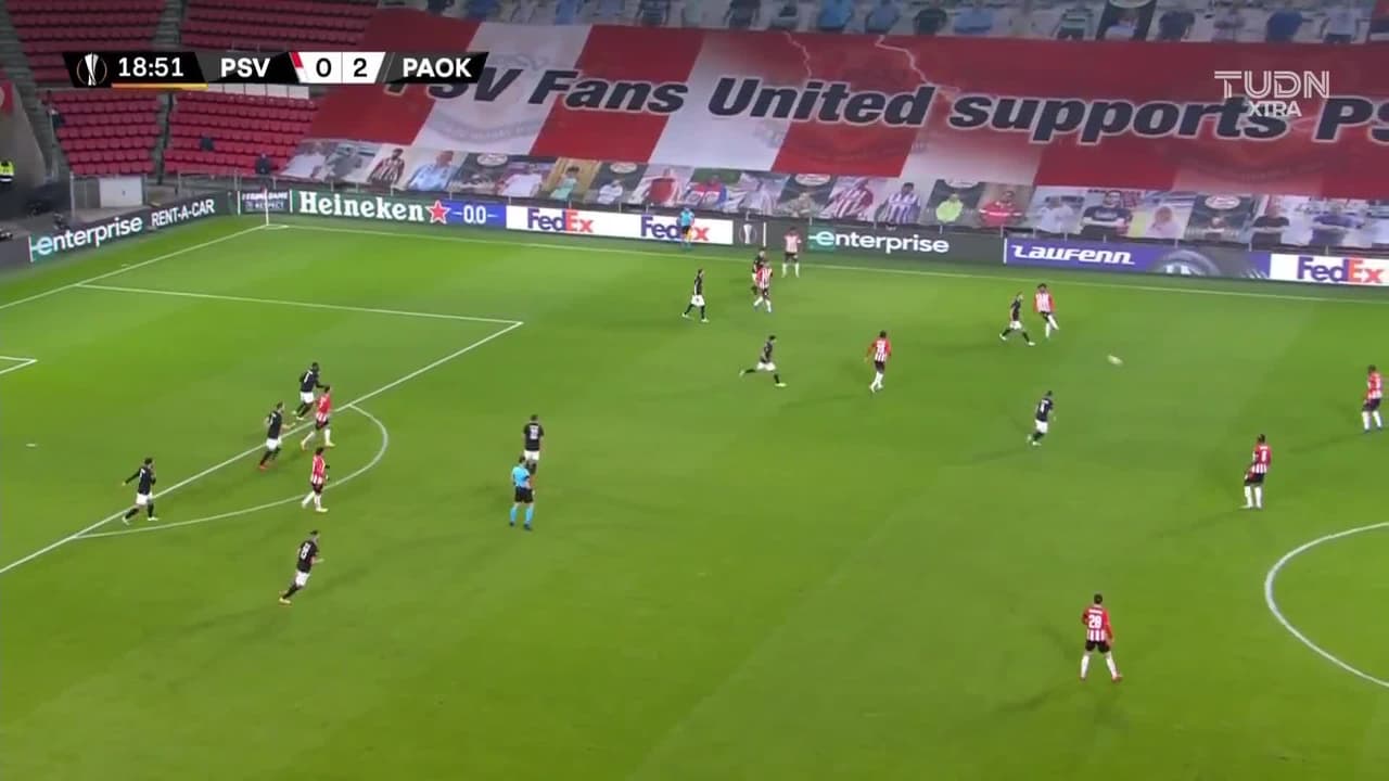 ¡Gol! PSV Eindhoven 1| PAOK Salonika 2. Cody Gakpo (PSV Eindhoven) Disparo con la derecha desde el lado derecho dentro del área.
