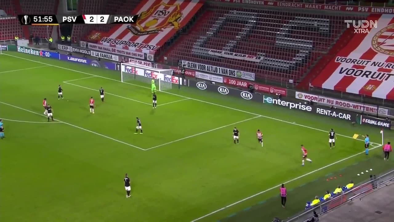 ¡Gol! PSV Eindhoven 3| PAOK Salonika 2. Donyell Malen (PSV Eindhoven) Disparo con la derecha desde el centro del área al centro de la portería.
