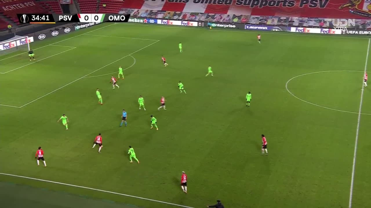 ¡Gol! PSV Eindhoven 1| Omonia Nicosia 0. Donyell Malen (PSV Eindhoven) Disparo con la derecha desde muy cerca disparo rastrero| junto al palo izquierdo. Asistencia de Philipp Max con un centro al área.