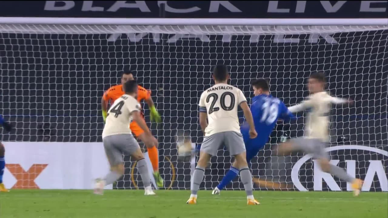 ¡Gol! Leicester City 2| AEK Athens 0. Harvey Barnes (Leicester City) Disparo con la derecha desde el lado izquierdo dentro del área disparo rastrero| junto al palo izquierdo.
