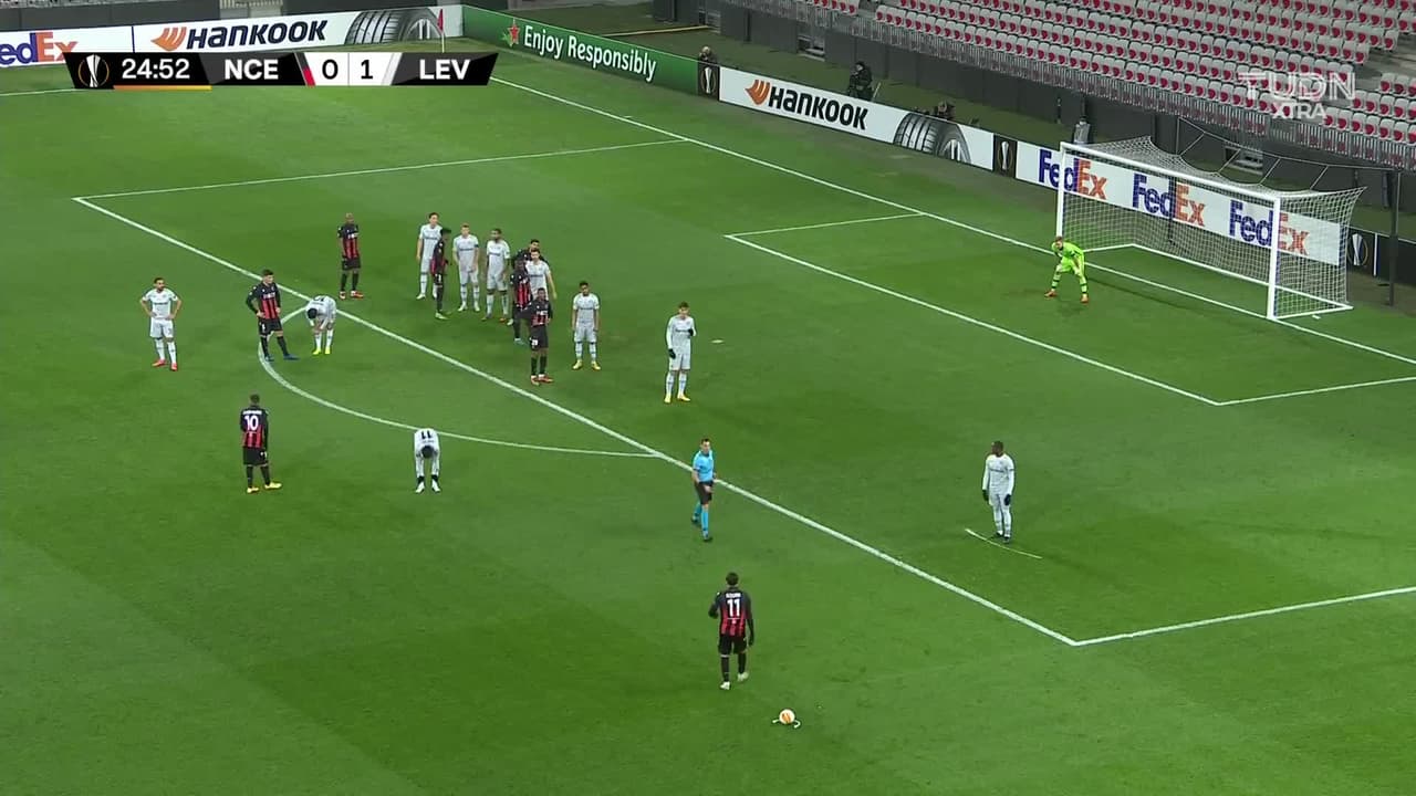 ¡Gol! Nice 1| Bayer 04 Leverkusen 1. Hassane Kamara (Nice) zurdazo desde fuera del área por el lado derecho de la portería tras el cobro de una falta.