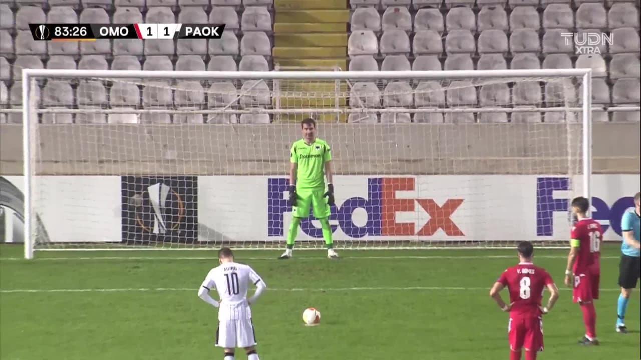 ¡Gol! Omonia Nicosia 2| PAOK Salonika 1. Jordi Gómez (Omonia Nicosia) convirtió el penalti zurdazo al centro de la portería.