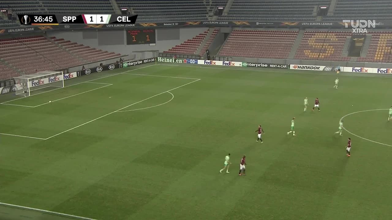 ¡Gol! Sparta Prague 2| Celtic 1. Lukas Julis (Sparta Prague) Disparo con la derecha desde muy cerca disparo rastrero| junto al palo izquierdo. Asistencia de Borek Dockal con un centro al área.