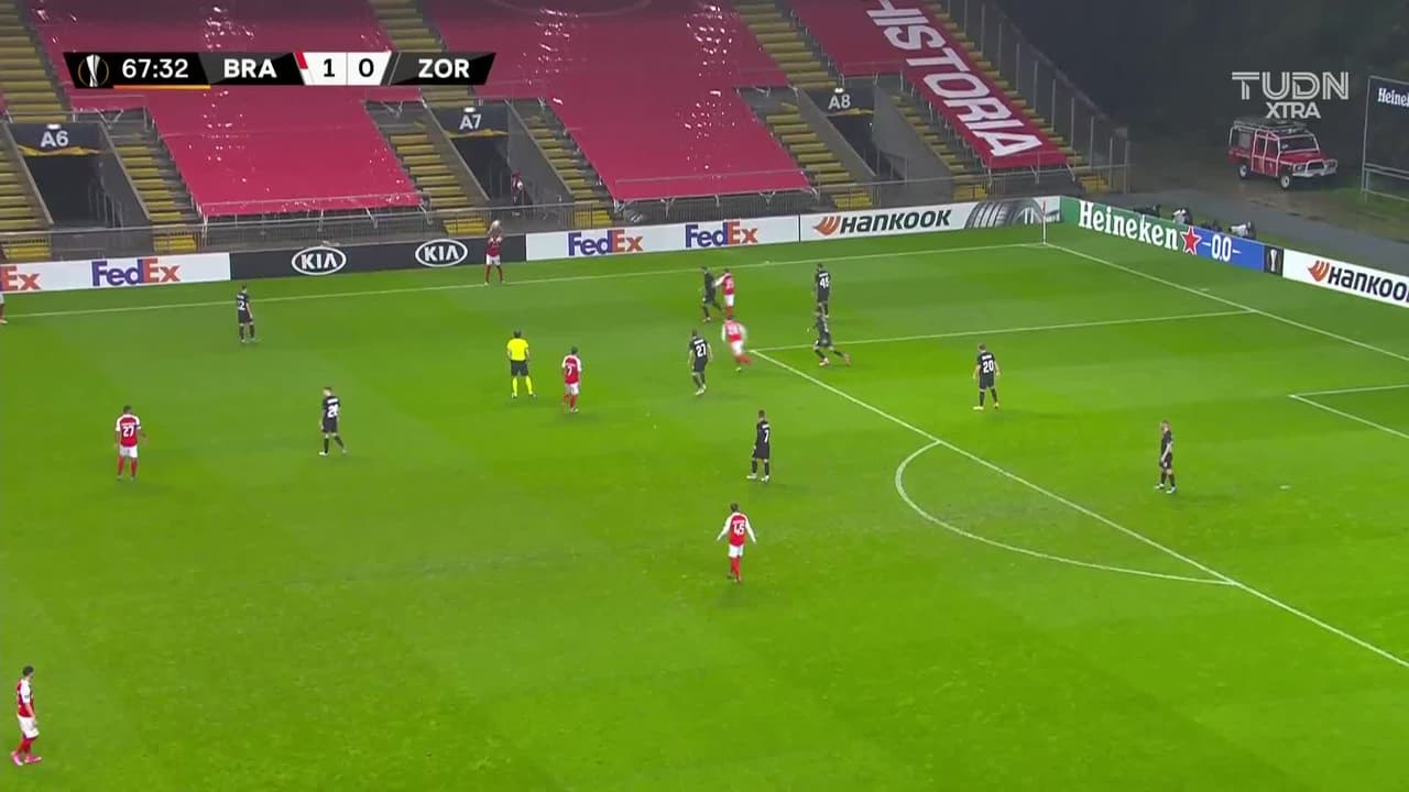 ¡Gol! Sporting Braga 2| Zorya Luhansk 0. Ricardo Horta (Sporting Braga) Disparo con la derecha desde el centro del área.