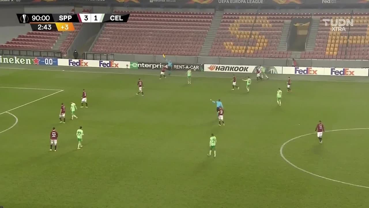 ¡Gol! Sparta Prague 4| Celtic 1. Srdan Plavsic (Sparta Prague) zurdazo desde el centro del área tras un contragolpe.