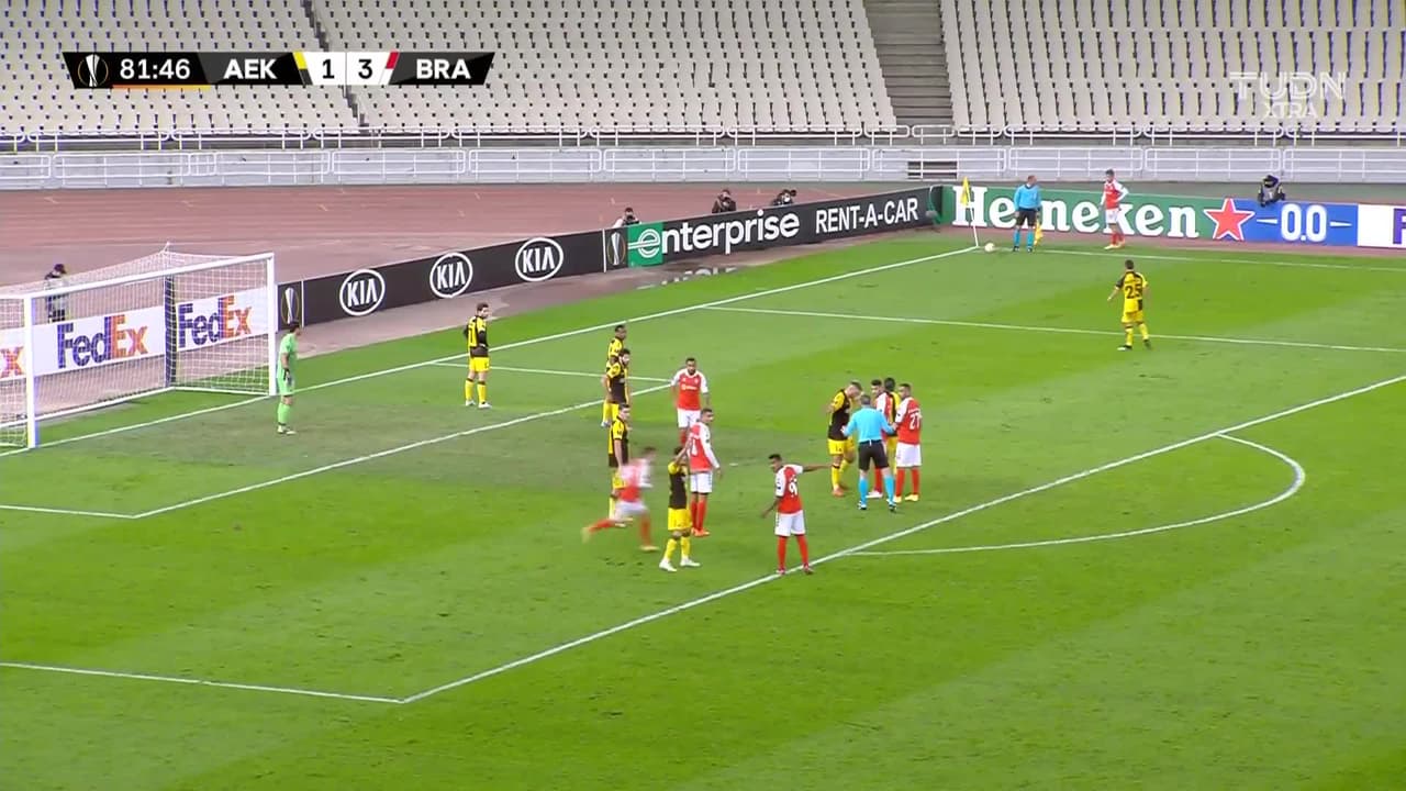 ¡Gol! AEK Athens 1| Sporting Braga 4. Wenderson Galeno (Sporting Braga) Disparo con la derecha desde fuera del área tras un saque de esquina.