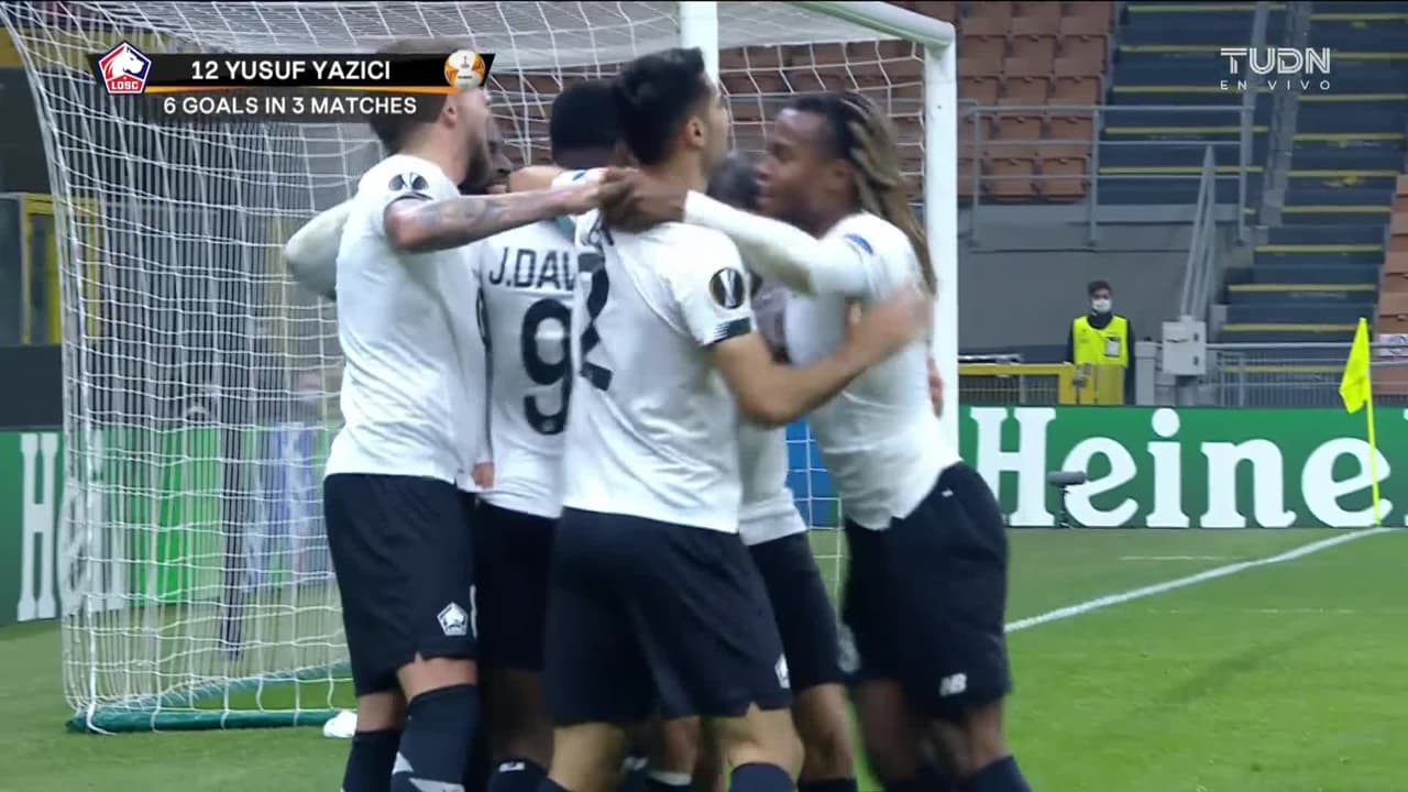 ¡Gol! Milan 0| Lille 3. Yusuf Yazici (Lille) zurdazo desde el centro del área disparo rastrero| junto al palo izquierdo. Asistencia de Jonathan Christian David tras un contragolpe.