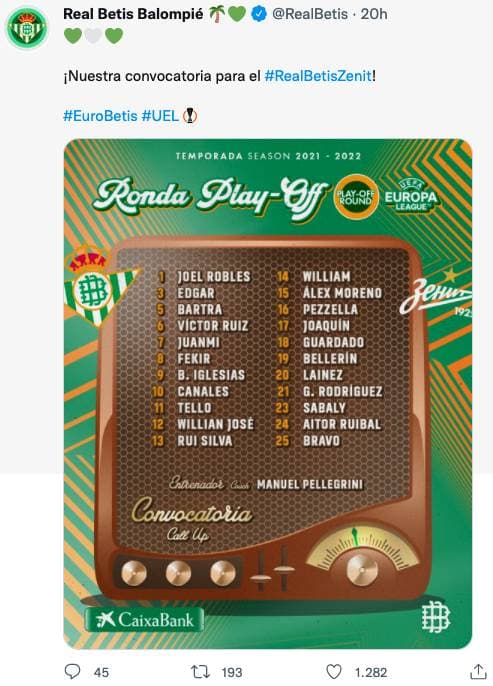 El Betis-Zenit llega al Benito Villamarín tras el 2-3 a favor del equipo español en el partido de ida que se disputó el pasado jueves en San Petersburgo.
