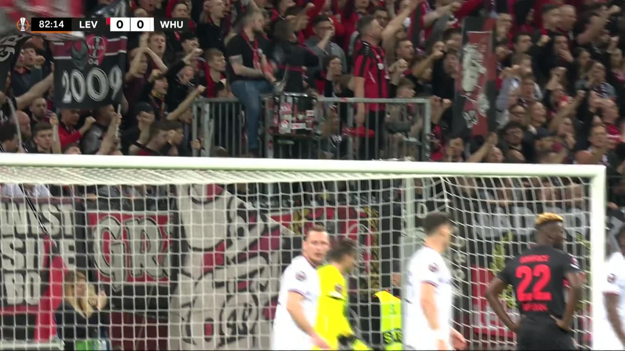 ¡Gol! Bayer 04 Leverkusen 1| West Ham United 0. Jonas Hofmann (Bayer 04 Leverkusen) zurdazo desde el centro del área tras un saque de esquina.