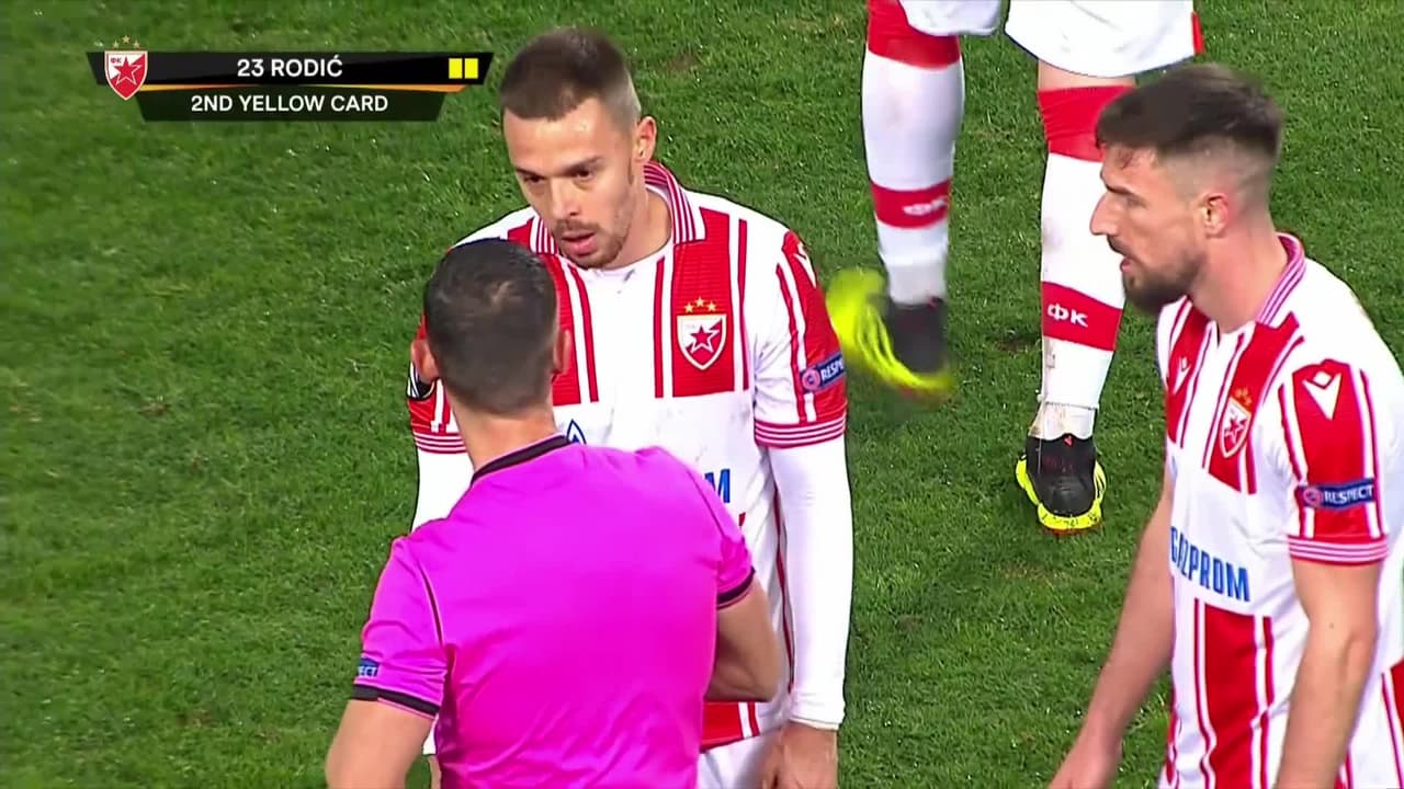 Milan Rodic (Estrella Roja de Belgrado) segunda tarjeta amarilla por juego peligroso.