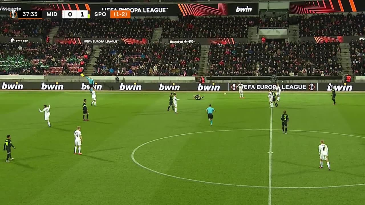 Paulinho (FC Midtjylland) segunda tarjeta amarilla por juego peligroso.