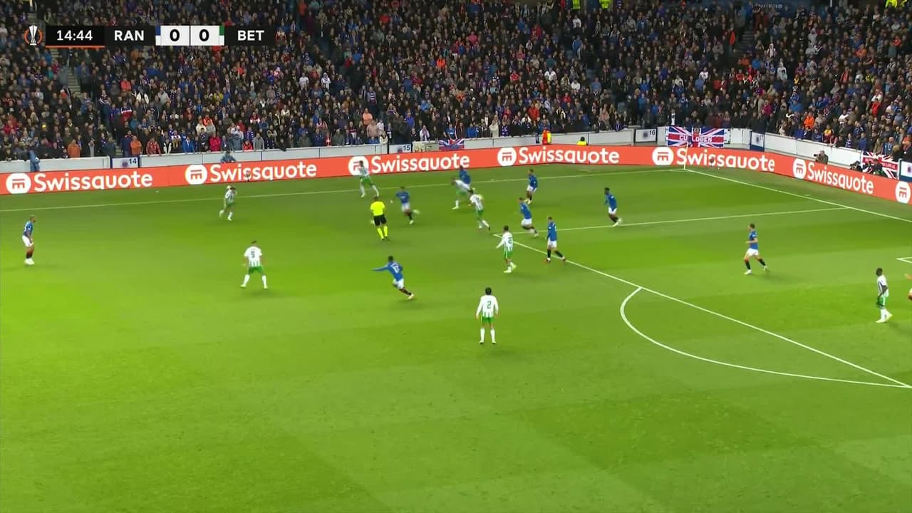Tiro atajado. Abde Ezzalzouli (Real Betis) Disparo con la derecha desde fuera del área.