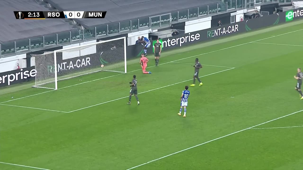 Tiro atajado. Alexander Isak (Real Sociedad) Disparo con la derecha desde el lado derecho dentro del área.