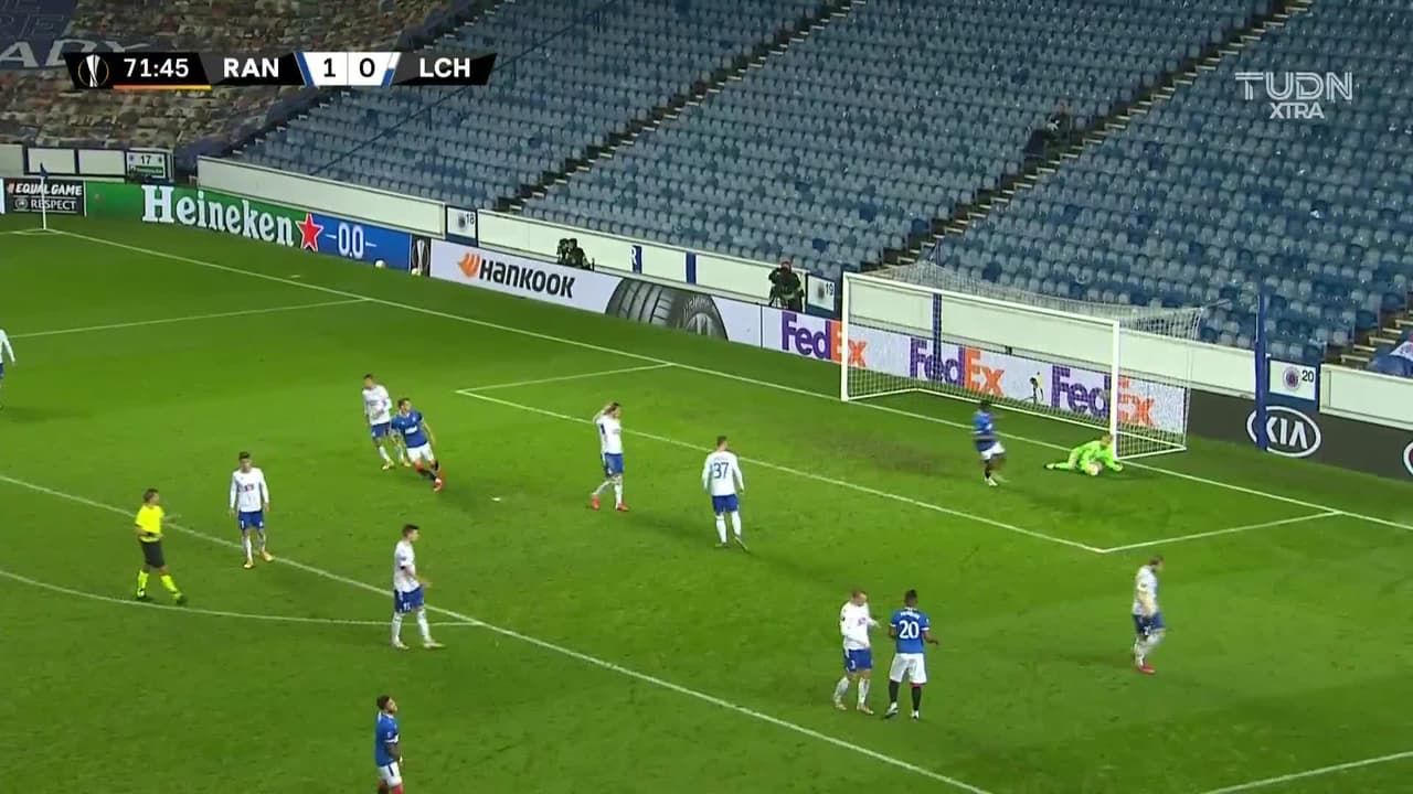 Tiro atajado junto al lado derecho de la portería. Alfredo Morelos (Rangers) Disparo con la derecha desde el lado derecho dentro del área. Asistencia de Scott Arfield.