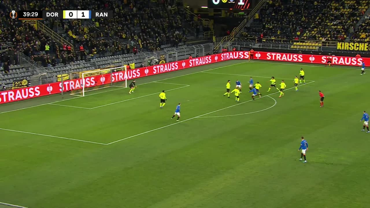Tiro atajado junto al lado derecho de la portería. Alfredo Morelos (Rangers) Disparo con la derecha sin ángulo desde la derecha.