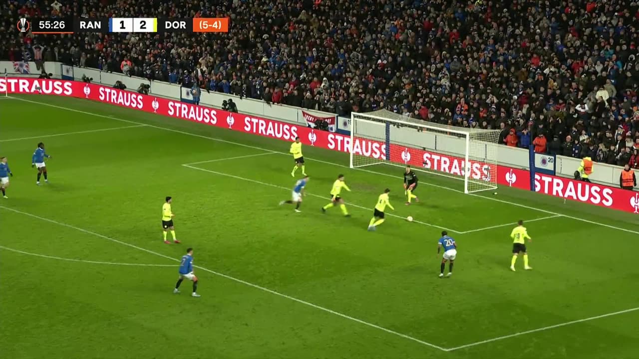 Tiro atajado. Alfredo Morelos (Rangers) Disparo con la derecha desde el lado derecho dentro del área.