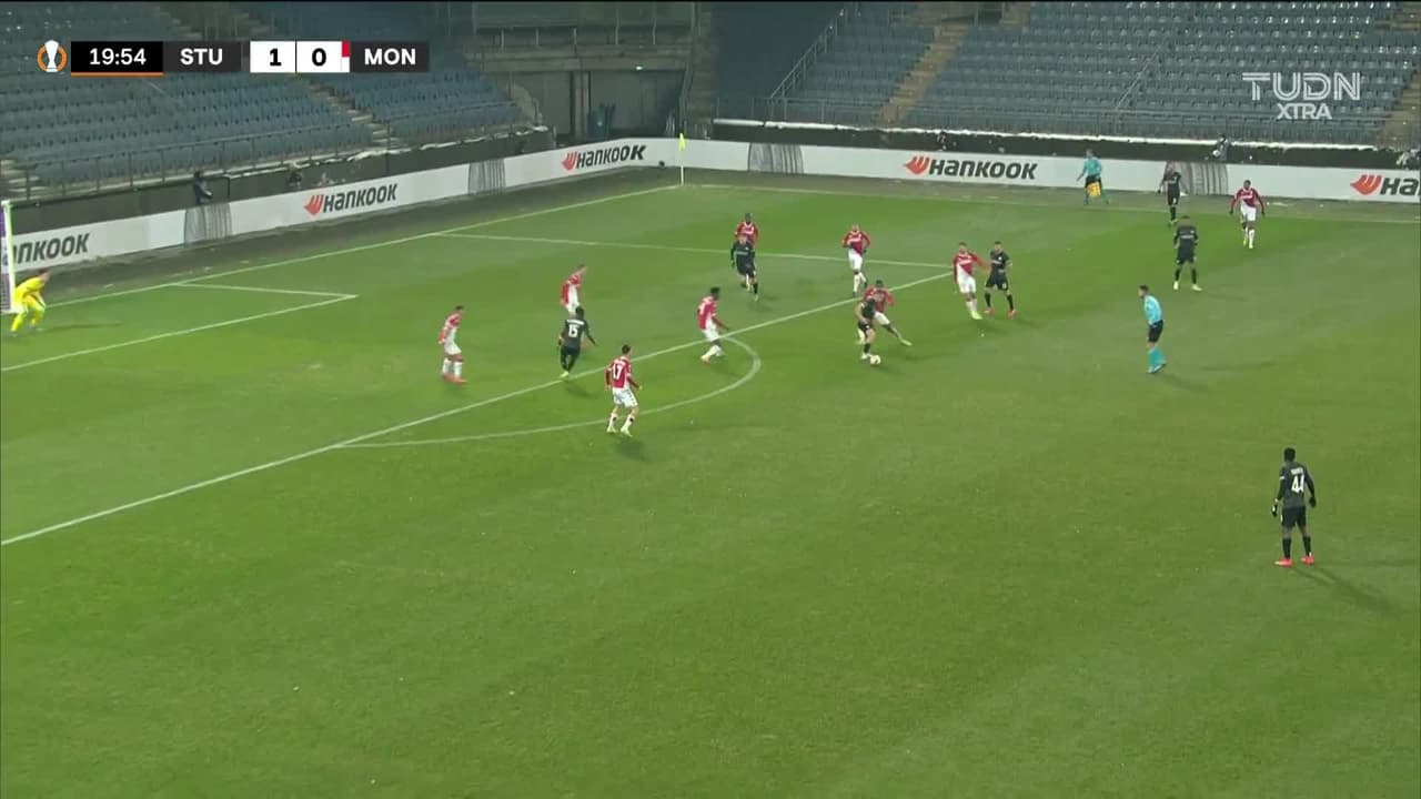 Tiro atajado. Amadou Dante (SK Puntigamer Sturm Graz) Disparo con la derecha desde fuera del área.