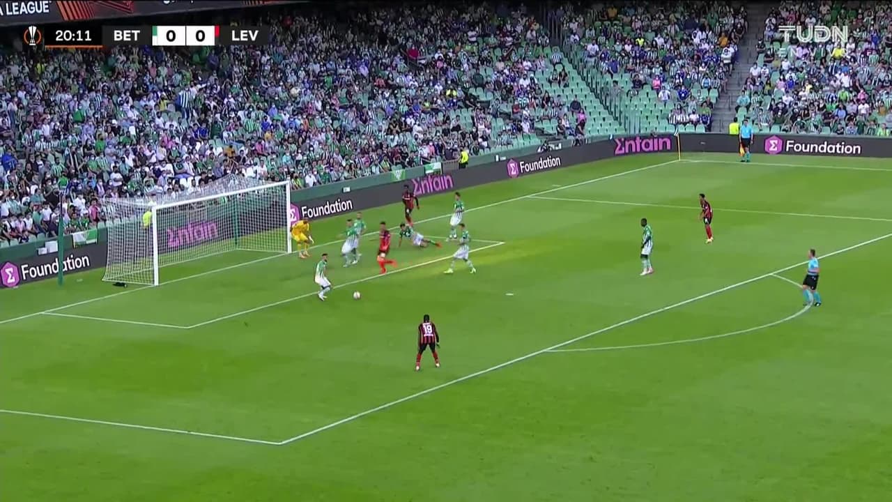Tiro atajado junto al lado derecho de la portería. Amine Adli (Bayer 04 Leverkusen) Disparo con la derecha desde el centro del área.