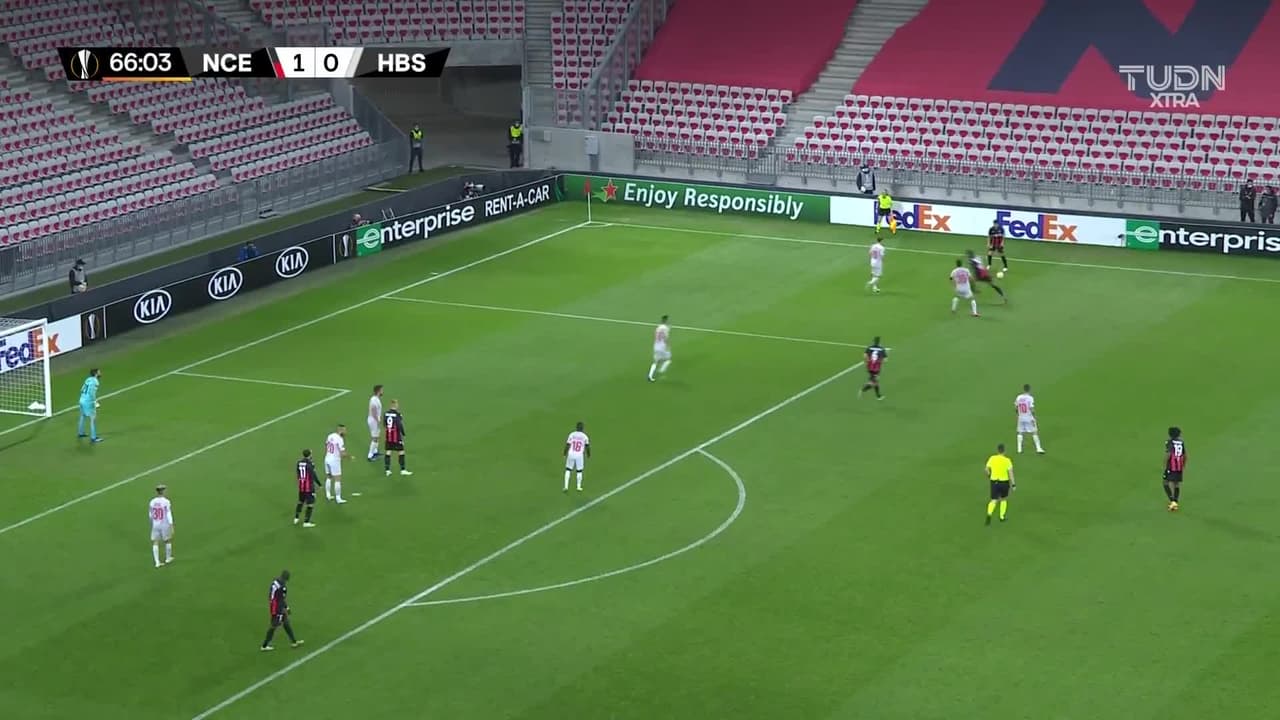 Tiro atajado Por arriba en el centro del arco. Amine Gouiri (Nice) disparo de cabeza desde el centro del área. Asistencia de Youcef Atal con un centro al área.