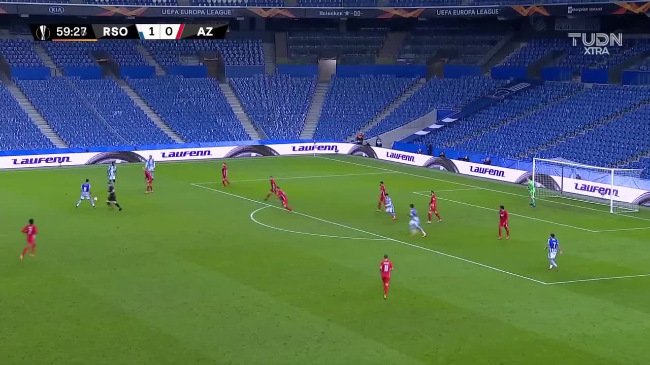 Tiro atajado raso al centro del arco. Aritz Elustondo (Real Sociedad) Disparo con la derecha desde fuera del área.