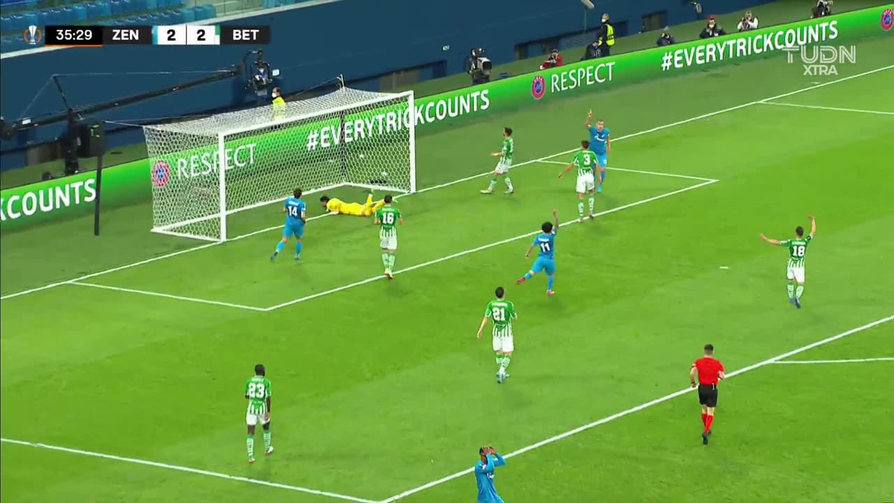 Tiro atajado Por arriba en el centro del arco. Artem Dzyuba (Zenit St Petersburg) disparo de cabeza desde el centro del área. Asistencia de Malcom con un centro al área.