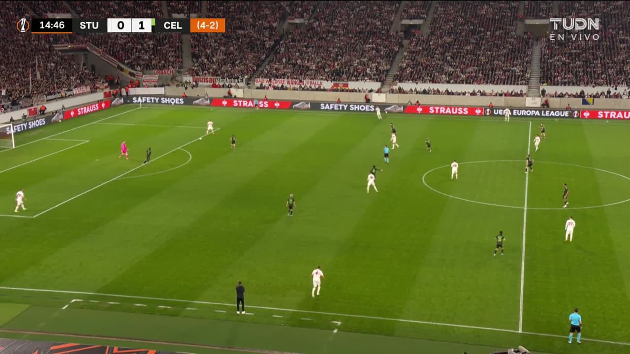 Tiro atajado. Badredine Bouanani (VfB Stuttgart) zurdazo desde fuera del área.