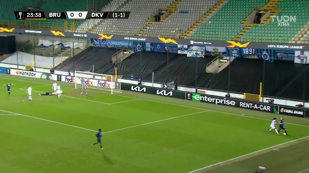 Tiro atajado raso al centro del arco. Bas Dost (Club Brugge) disparo de cabeza desde el centro del área. Asistencia de Clinton Mata con un centro al área.