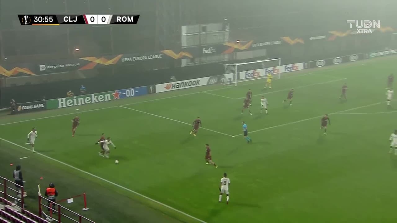 Tiro atajado. Borja Mayoral (AS Roma) Disparo con la derecha sin ángulo desde la derecha.
