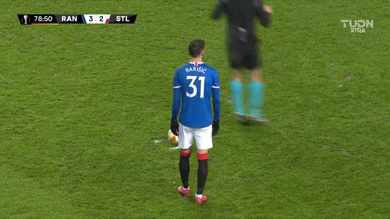 Tiro atajado. Borna Barisic (Rangers) zurdazo desde fuera del área.