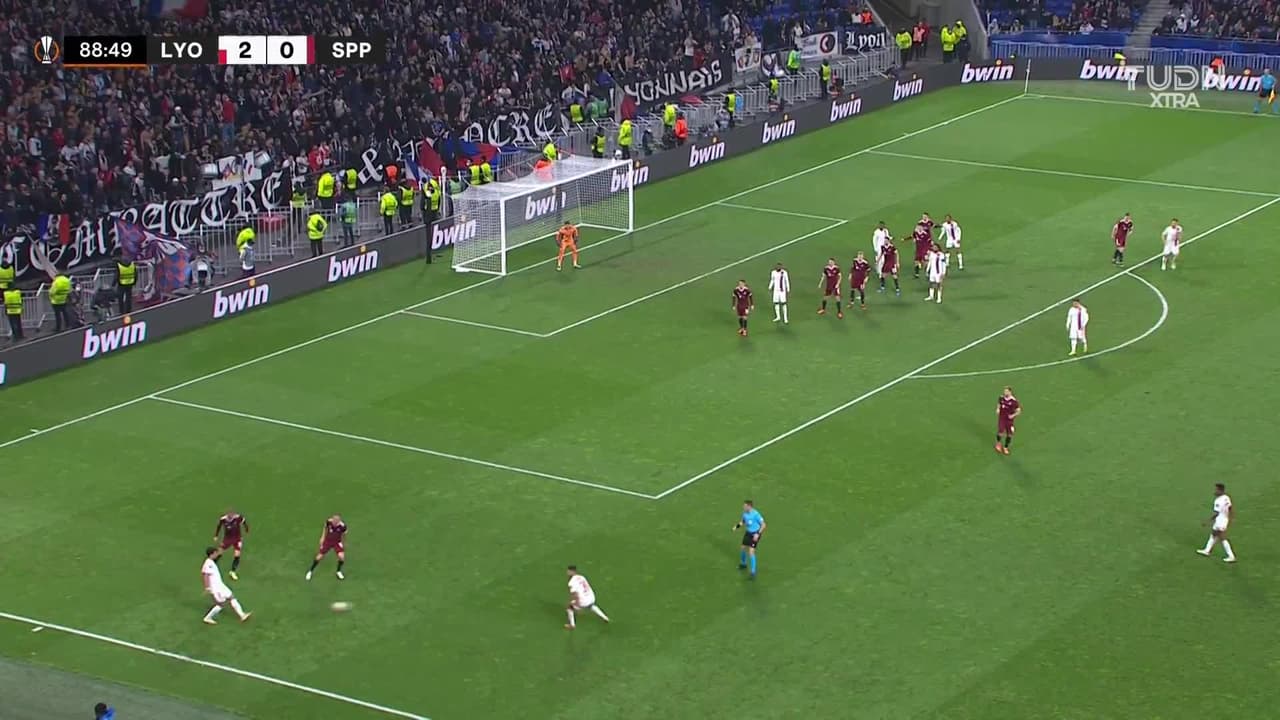 Tiro atajado. Bruno Guimarães (Lyon) Disparo con la derecha sin ángulo desde la izquierda.