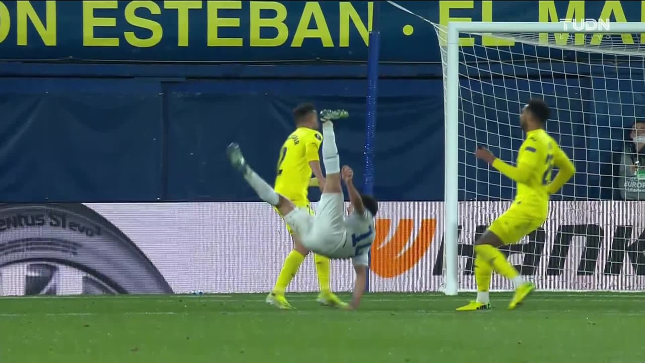 Tiro atajado Por arriba en el centro del arco. Carlos de Pena (Dynamo Kyiv) zurdazo desde el centro del área.