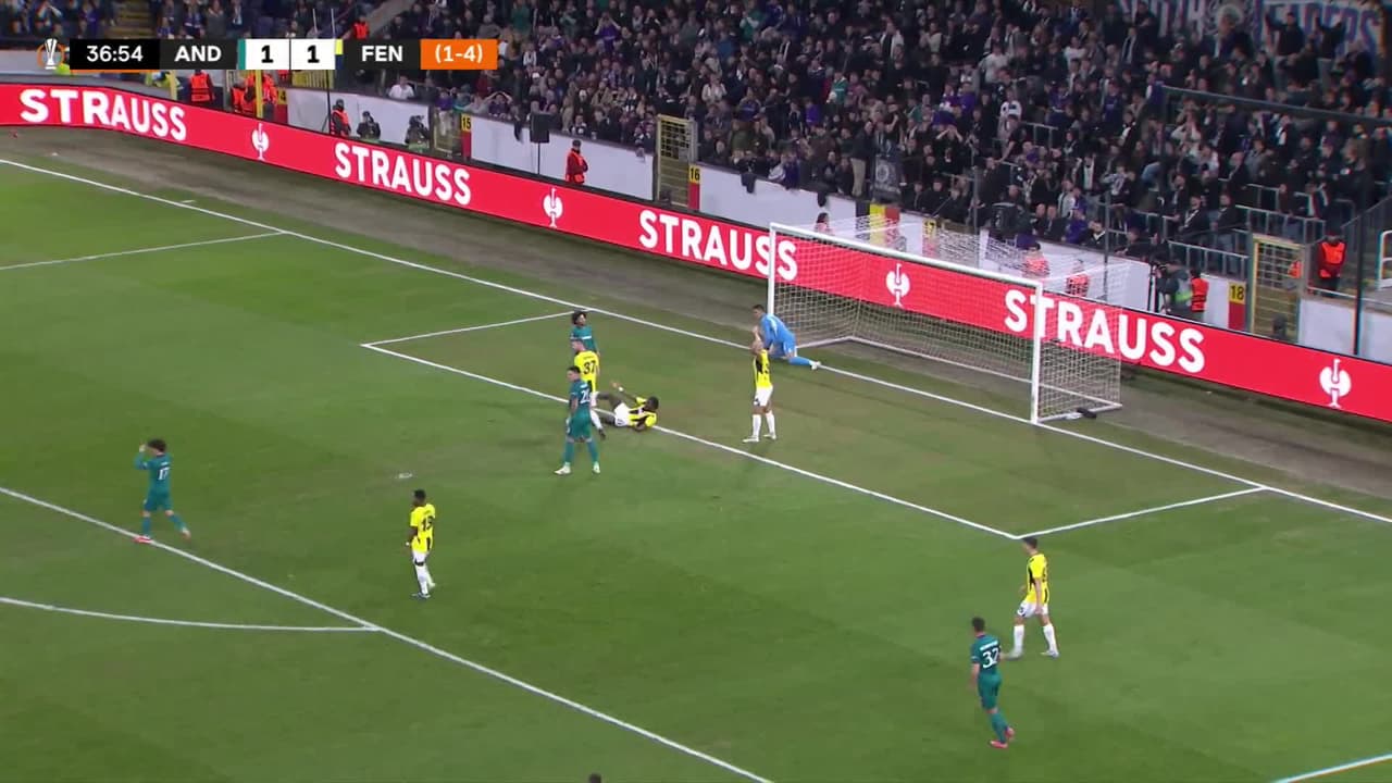 Tiro atajado al ángulo superior derecho. César Huerta (RSC Anderlecht) disparo de cabeza desde el centro del área. Asistencia de Killian Sardella con un centro al área.