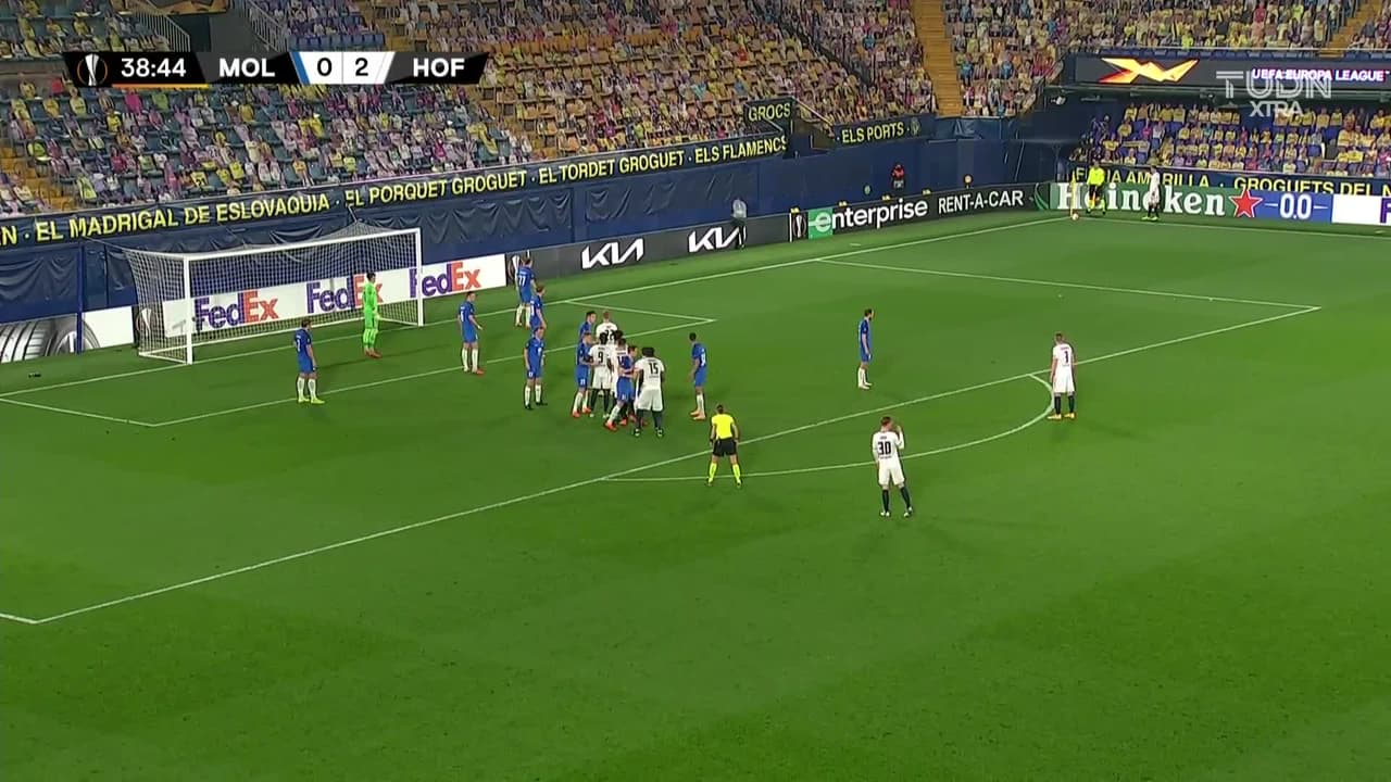 Tiro atajado al ángulo superior derecho. Christoph Baumgartner (TSG 1899 Hoffenheim) disparo de cabeza desde el centro del área. Asistencia de Sebastian Rudy con un centro al área.
