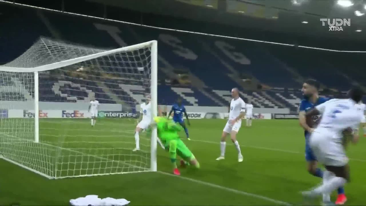 Tiro atajado Por arriba en el centro del arco. Christoph Baumgartner (TSG 1899 Hoffenheim) disparo de cabeza desde el centro del área. Asistencia de Florian Grillitsch.