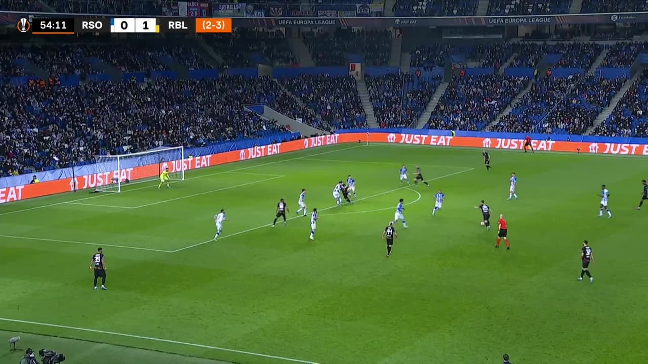Tiro atajado por abajo a la izquierda. Dani Olmo (RB Leipzig) Disparo con la derecha desde fuera del área. Asistencia de Kevin Kampl.