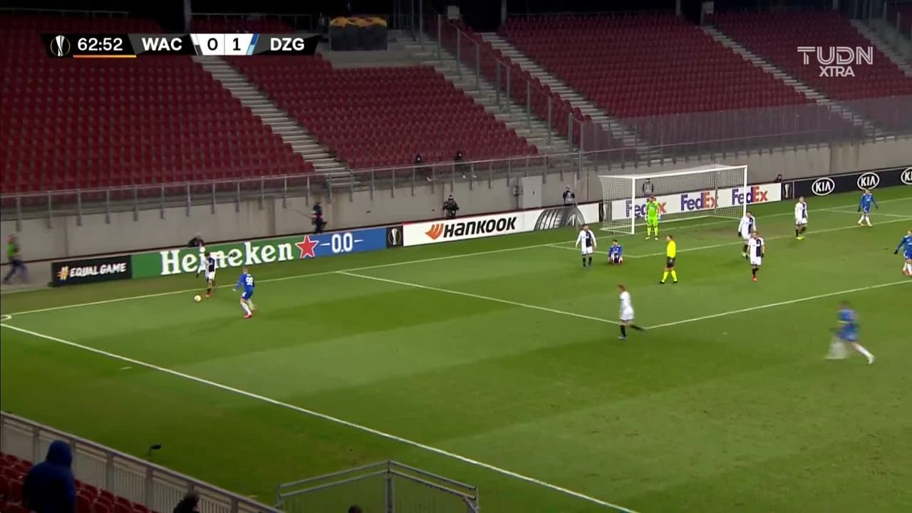 Tiro atajado junto al lado derecho de la portería. Dario Vizinger (RZ Pellets WAC) Disparo con la derecha desde el lado derecho dentro del área.