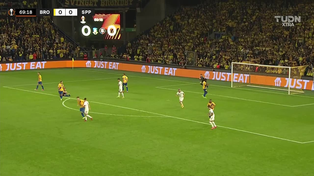 Remate parado. David Moberg-Karlsson (Sparta Prague) remate con la derecha desde fuera del área.
