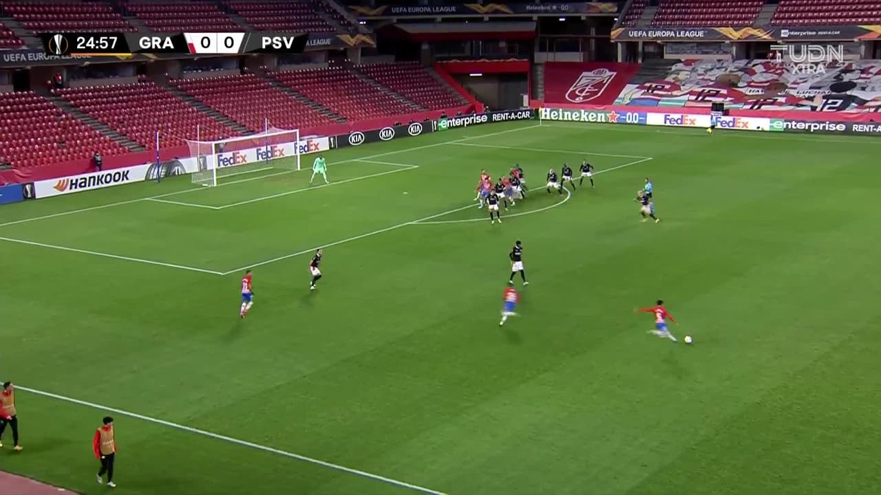 Tiro atajado raso al centro del arco. Domingos Duarte (Granada CF) zurdazo desde el centro del área. Asistencia de Luis Milla.