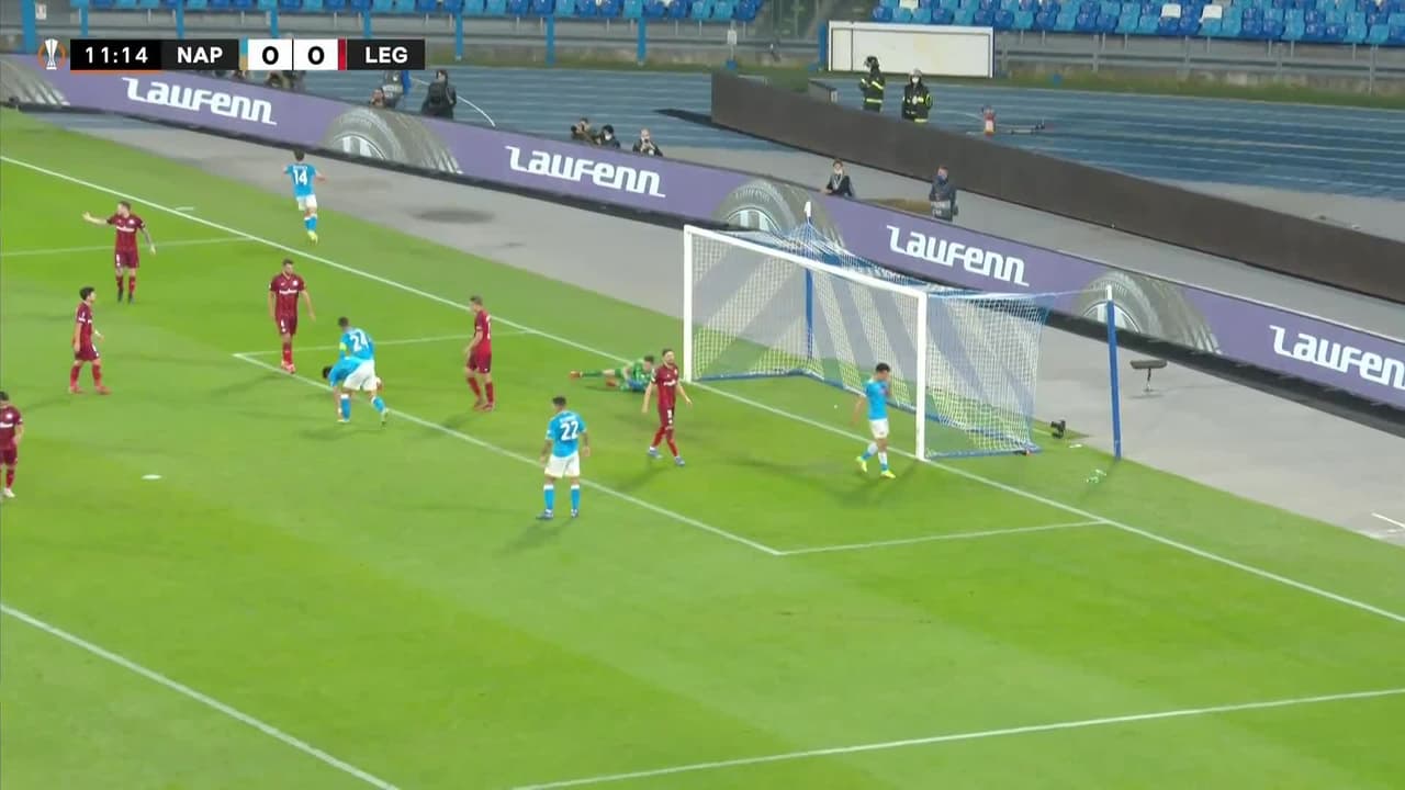 Tiro atajado Por arriba en el centro del arco. Dries Mertens (Napoli) Disparo con la derecha desde el lado izquierdo dentro del área.