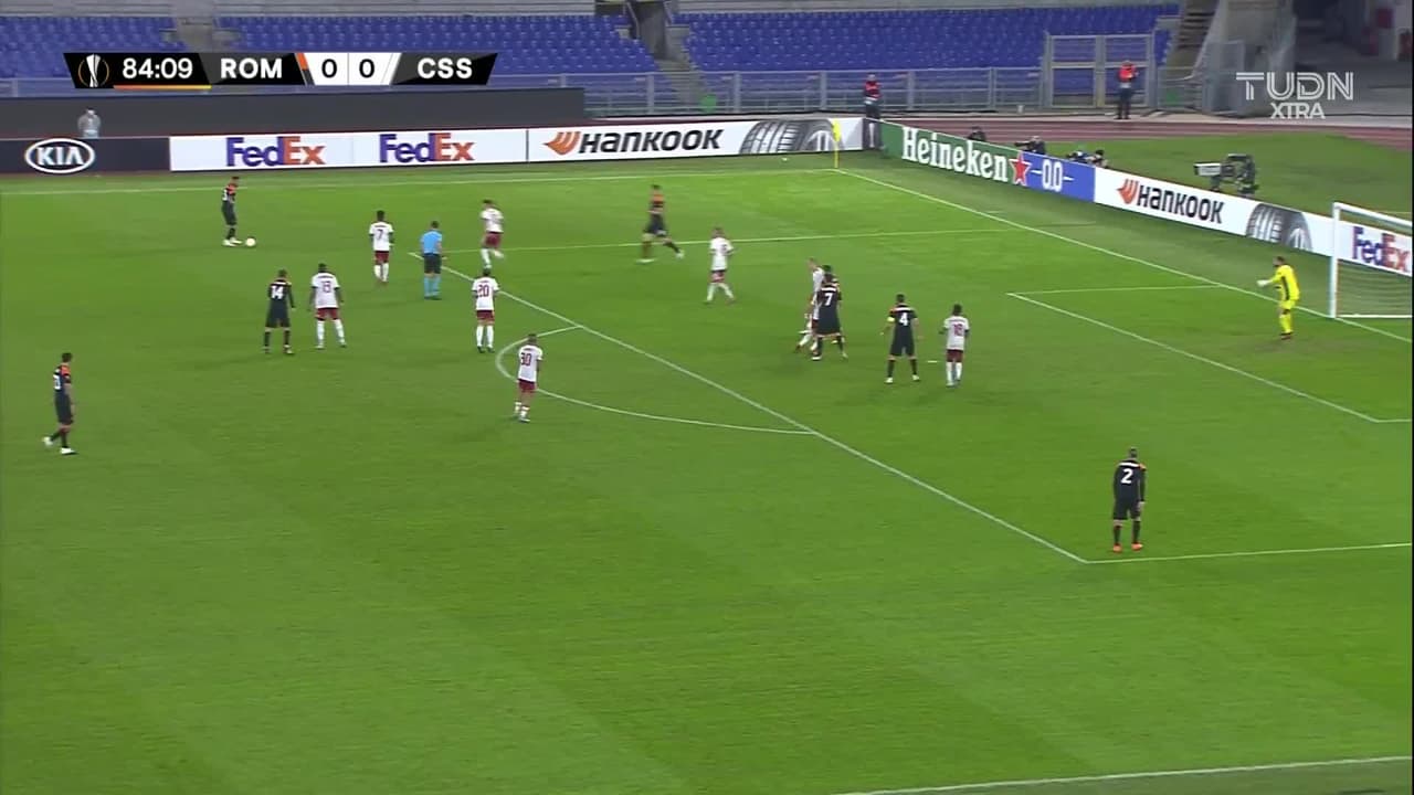 Tiro atajado raso al centro del arco. Edin Dzeko (AS Roma) Disparo con la derecha sin ángulo desde la izquierda. Asistencia de Bruno Peres.