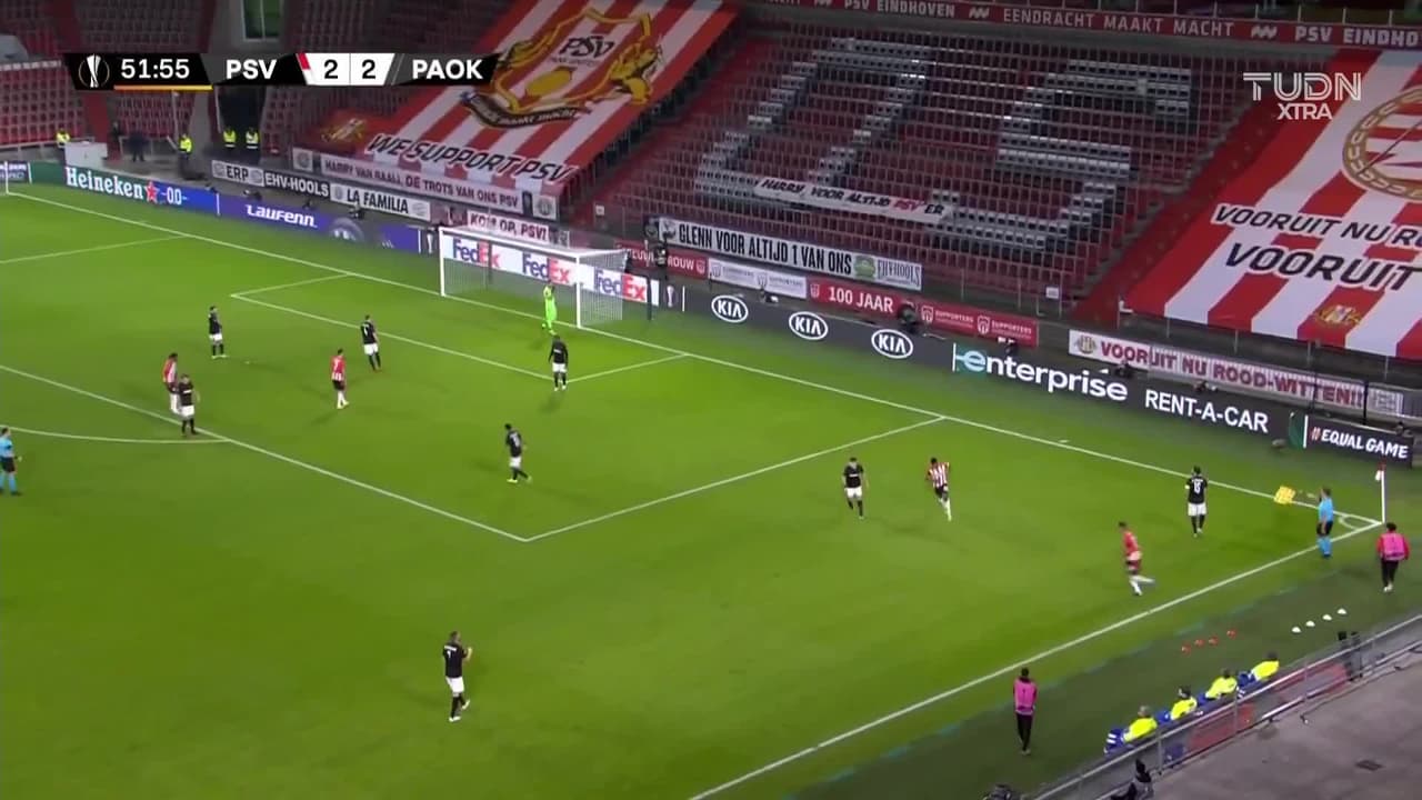 Tiro atajado. Eran Zahavi (PSV Eindhoven) zurdazo desde el centro del área.