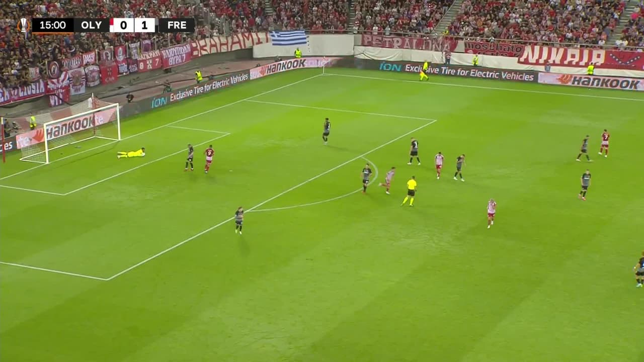Tiro atajado raso al centro del arco. Giorgos Masouras (Olympiakos) Disparo con la derecha desde fuera del área. Asistencia de Santiago Hezze con un pase de cabeza.