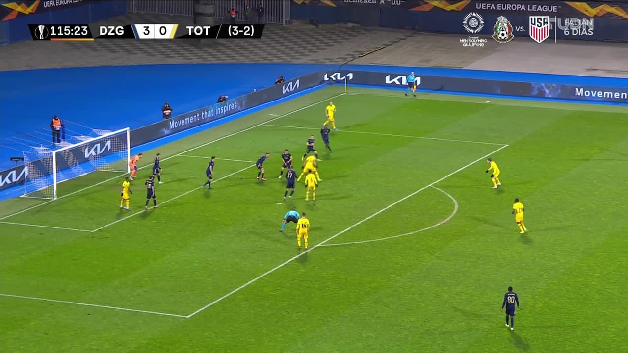 Tiro atajado raso al centro del arco. Harry Kane (Tottenham Hotspur) zurdazo desde el centro del área. Asistencia de Carlos Vinícius.