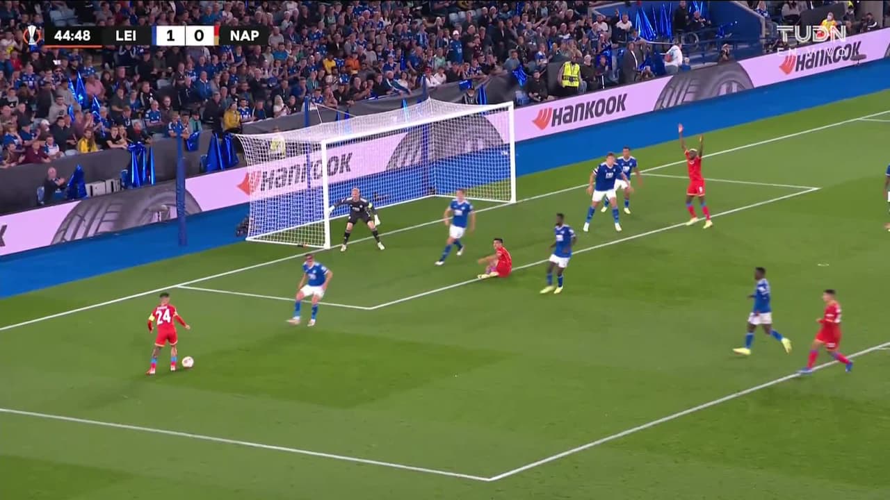Tiro atajado raso al centro del arco. Hirving Lozano (Napoli) disparo de cabeza desde el centro del área. Asistencia de Kevin Malcuit con un centro al área.