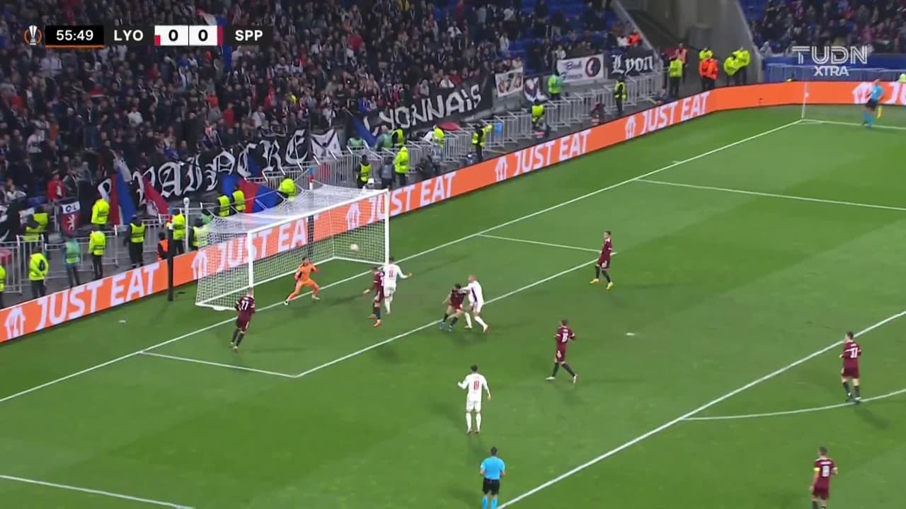 Tiro atajado raso al centro del arco. Houssem Aouar (Lyon) disparo de cabeza desde el centro del área. Asistencia de Henrique con un centro al área.