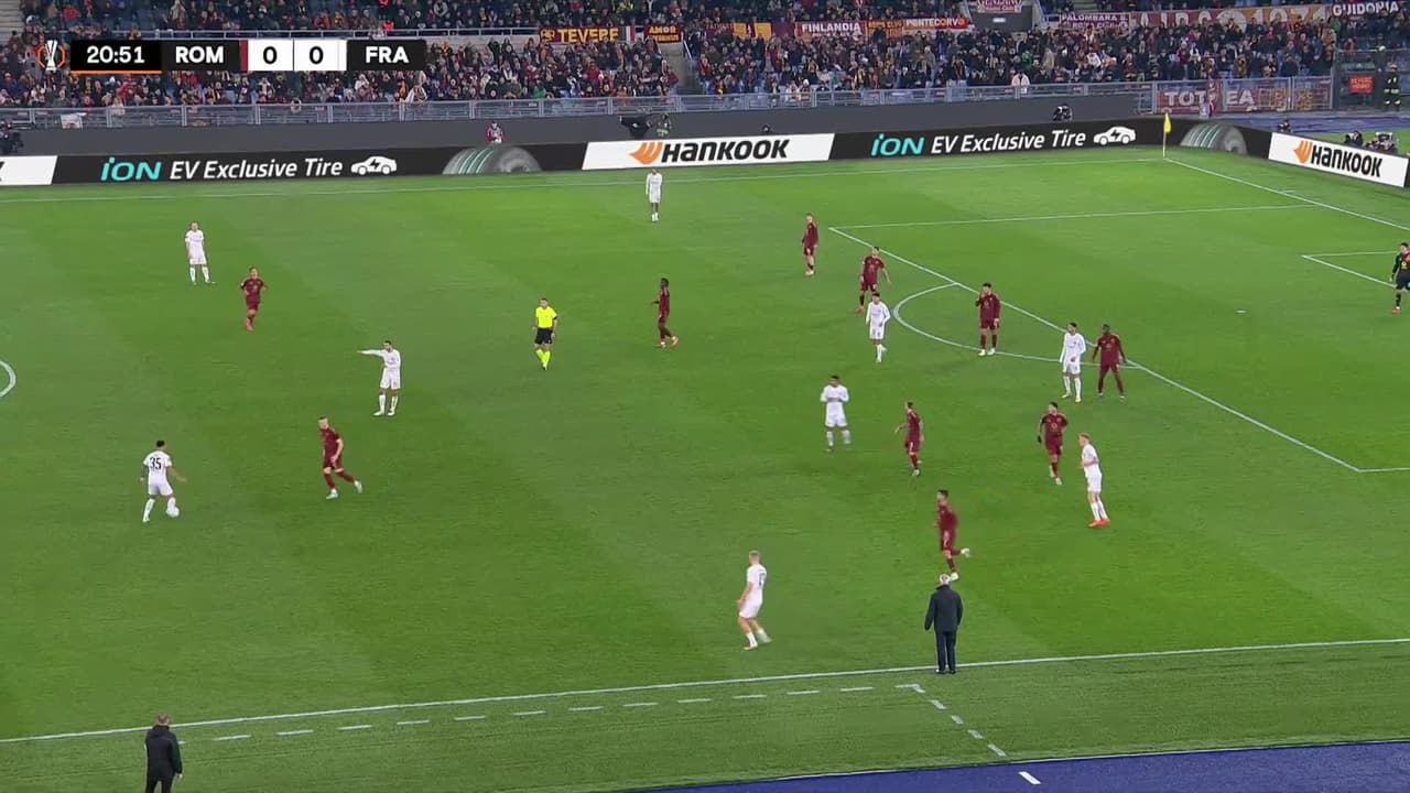Tiro atajado Por arriba en el centro del arco. Hugo Larsson (Eintracht Frankfurt) disparo de cabeza desde el centro del área. Asistencia de Jean-Mattéo Bahoya con un centro al área.