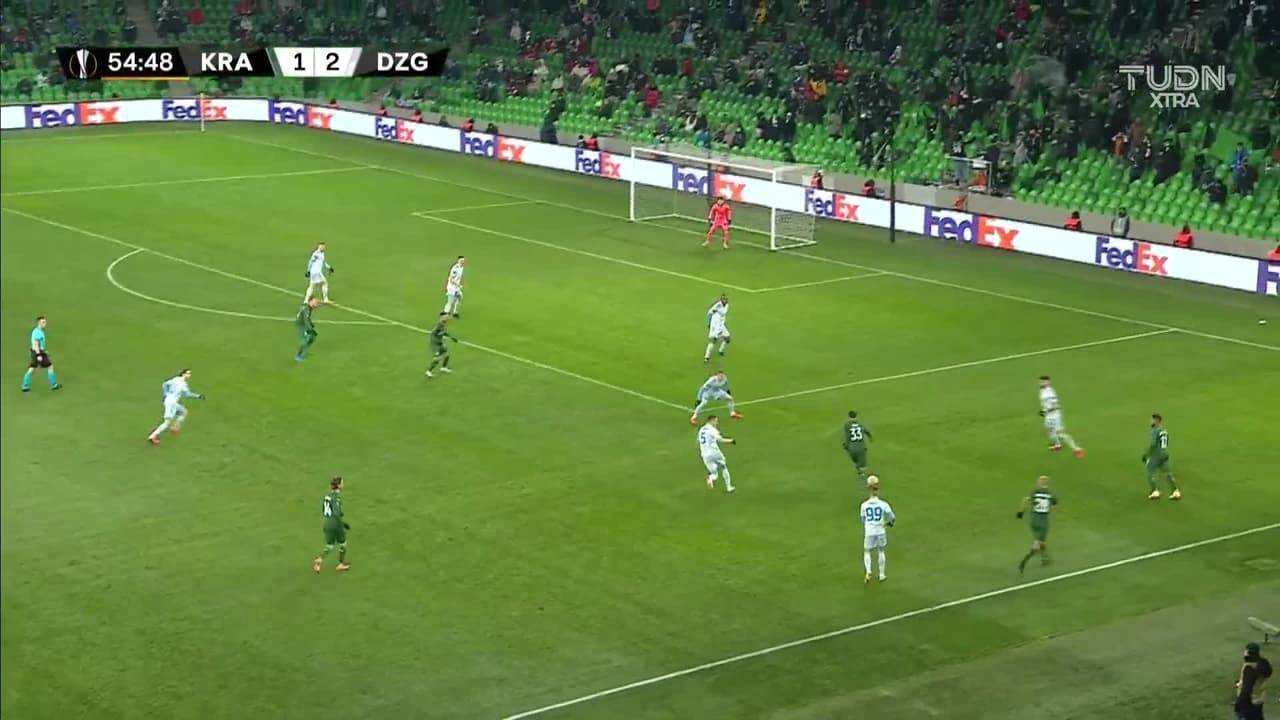 Tiro atajado al ángulo superior derecho. Igor Smolnikov (FK Krasnodar) Disparo con la derecha desde el lado derecho dentro del área. Asistencia de Viktor Claesson después de un pase en profundidad.