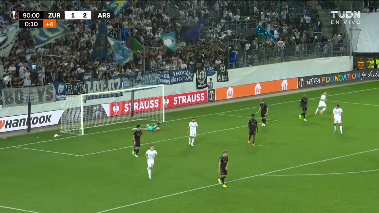 Tiro atajado Por arriba en el centro del arco. Ivan Santini (FC Zürich) disparo de cabeza desde el centro del área.