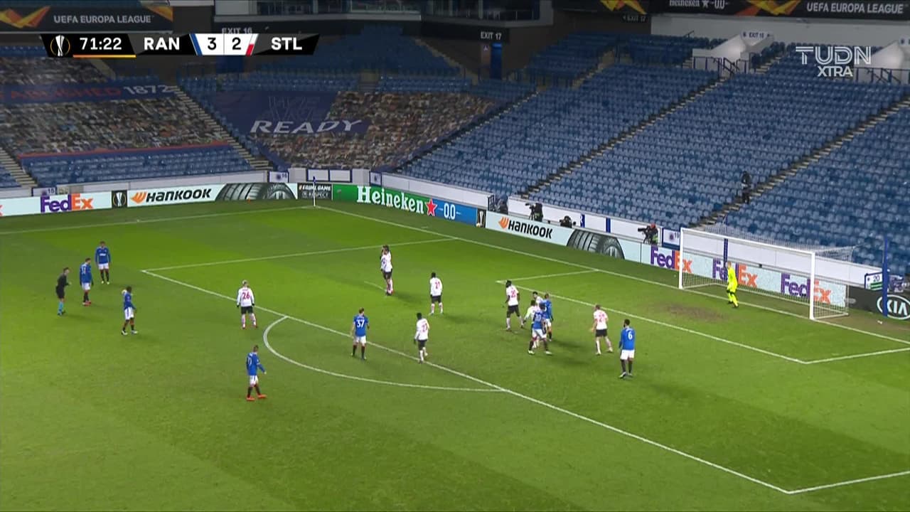 Tiro atajado por abajo a la izquierda. James Tavernier (Rangers) Disparo con la derecha desde fuera del área.
