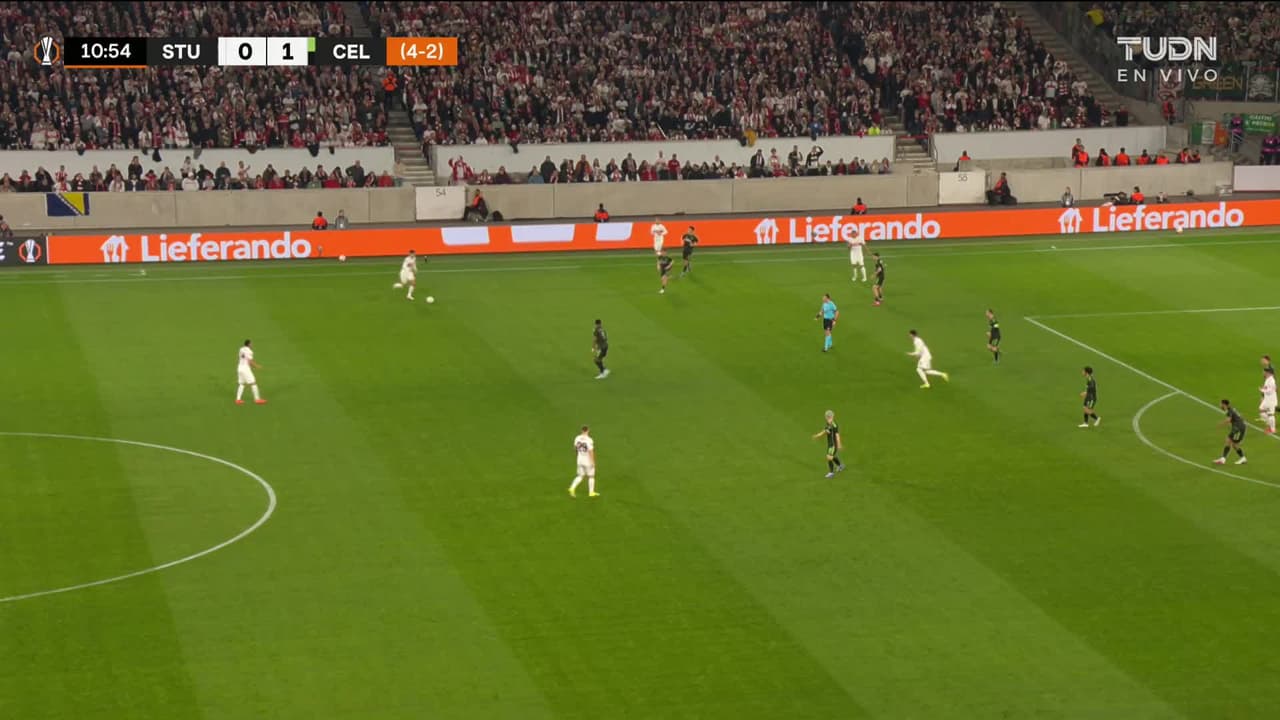 Tiro atajado. Jamie Leweling (VfB Stuttgart) Disparo con la derecha desde el lado izquierdo dentro del área.